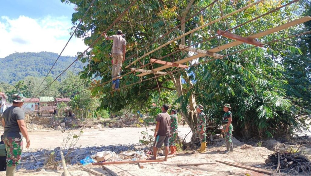ACEH TENGGARA, Cakra101.com – Prajurit TNI AD dari Posramil Darul Hasanah jajaran Kodim 0108/Aceh Tenggara, Korem 011/Lilawangsa, Kodam Iskandar Muda, bersama masyarakat Desa Buntul Kendawi, Kecamatan Darul Hasanah, Kabupaten Aceh Tenggara, melaksanakan perbaikan jembatan gantung yang rusak akibat banjir.