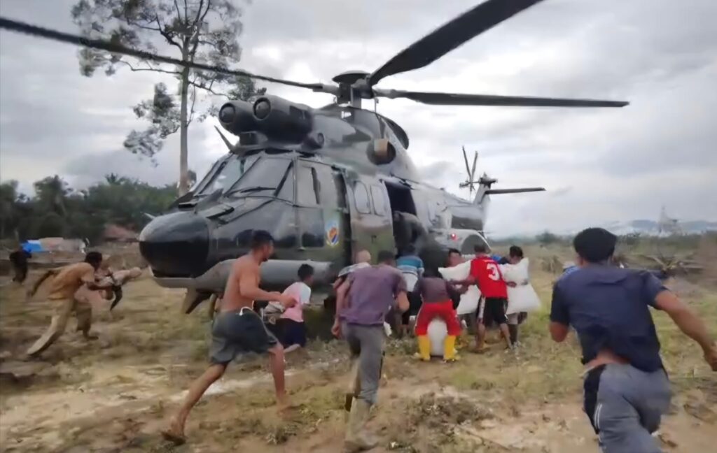 ACEH TAMIANG, Cakra101.com – Helikopter Super Puma TNI Angkatan Udara yang diberangkatkan dari Lanud Soewondo, Medan berhasil mendarat di helipad darurat di Desa Sekumur, Kecamatan Sekarak, Kabupaten Aceh Tamiang, Minggu (28/12/2025). Pendaratan tersebut memungkinkan penyaluran 1.000 kilogram bantuan bahan pangan bagi warga terdampak.