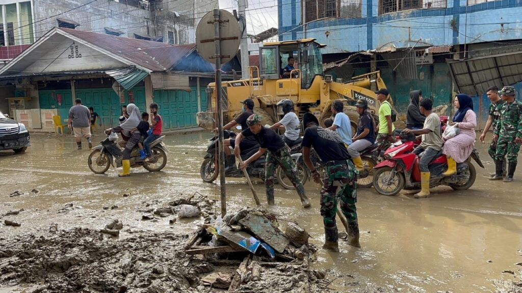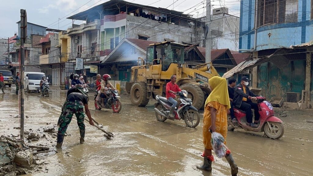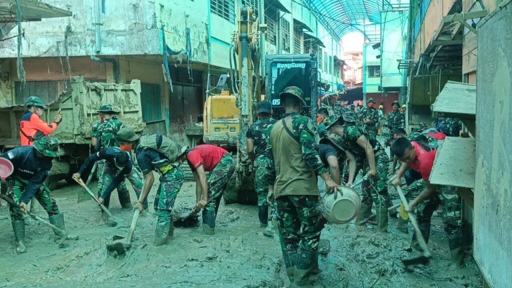 ACEH TAMIANG, Cakra101.com – Personel Satgas Penanggulangan Bencana Yonif 115/Macan Leuser dan Badan Nasional Penanggulangan Bencana (BNPB) melaksanakan pembersihan area Pasar Kota Hongkong dan ruas Jalan Lintas Pasar Kota, Kabupaten Aceh Tamiang, Senin (29/12/2025), sebagai upaya percepatan pemulihan pascabencana banjir.