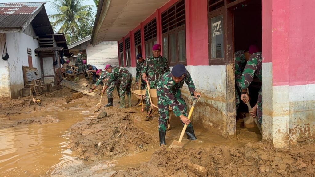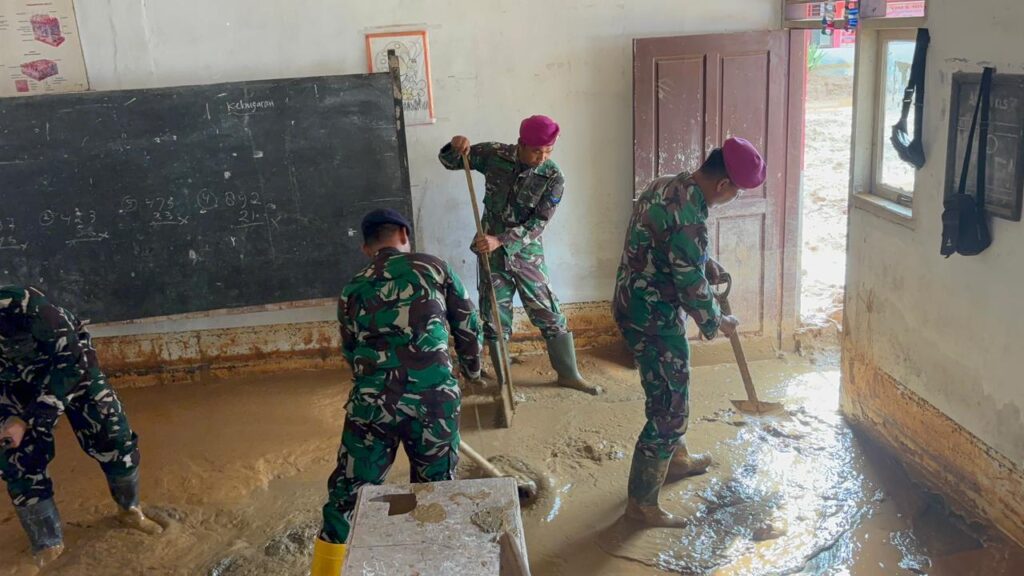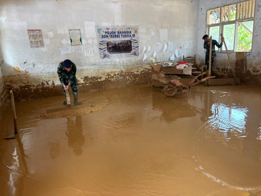 Pasca bencana yang melanda wilayah Kabupaten Tapanuli Tengah, sisa-sisa lumpur tebal masih mengendap di lantai kelas dan selasar sekolah. Kondisi ini menggerakkan para Prajurit Marinir TNI AL yang tergabung dalam Satgas Gulbencal Kodaeral II untuk turun melaksanakan perbantuan.