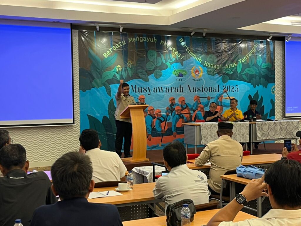 Musyawarah Nasional (Munas) Federasi Arung Jeram Indonesia (FAJI) Tahun 2025 menetapkan Mayor Jenderal TNI (Mar) Dr. Oni Junianto, S.A.P., M.M., M.Tr.Opsla sebagai Ketua Umum Pengurus Besar (PB) FAJI periode 2025–2029 melalui mekanisme aklamasi yang dilaksanakan di Jakarta Design Center (JDC), Jakarta Pusat, Senin (5/1/2025). Penetapan tersebut mencerminkan soliditas dan kesatuan sikap peserta Munas sebagai forum tertinggi organisasi FAJI. Munas dihadiri oleh perwakilan 19 Pengurus Provinsi (Pengprov) dari total 25 Pengprov FAJI se-Indonesia, sehingga dinyatakan memenuhi kuorum dan sah dalam pengambilan keputusan.
