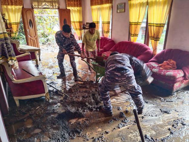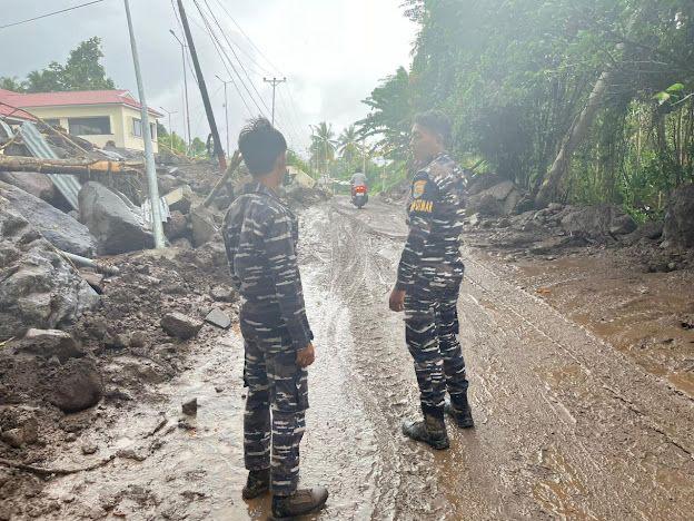 Menanggapi kondisi tersebut, personel Posal Siau segera turun langsung ke lokasi bencana untuk melaksanakan bantuan kemanusiaan. Kegiatan yang dilakukan meliputi evakuasi warga terdampak, pembersihan material lumpur dan puing-puing, serta membantu pendistribusian bantuan logistik kepada masyarakat.