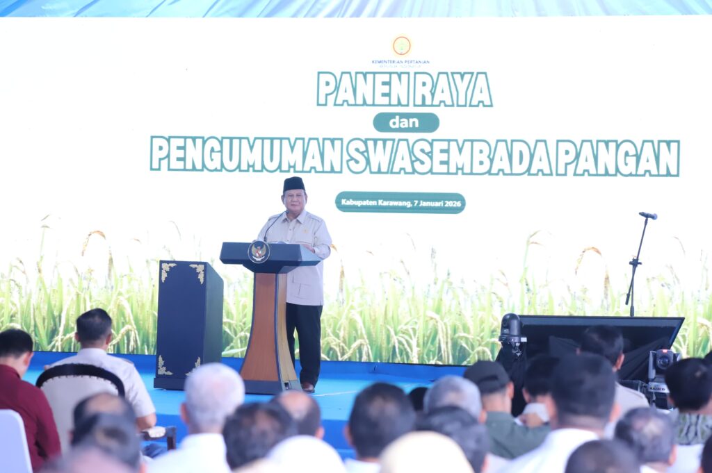 “Dengan mengucap bismillahirrahmanirrahim, pada pagi hari ini, hari Rabu 7 Januari 2026, saya Prabowo Subianto Presiden Republik Indonesia, dengan ini mengumumkan telah tercapainya swasembada pangan tahun 2025 bagi seluruh bangsa Indonesia,” ucap Presiden RI.