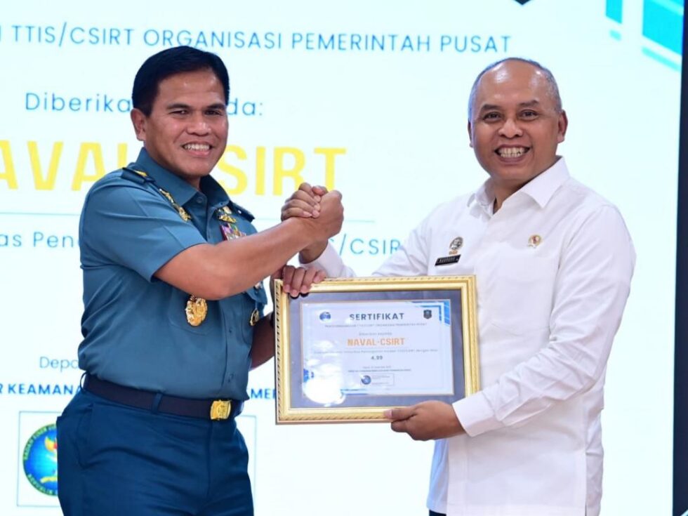 JAKARTA, Cakra101.com – Sebagai wujud komitmen TNI Angkatan Laut dalam memperkuat tata kelola keamanan informasi dan meningkatkan kesadaran keamanan siber, Kepala Staf Angkatan Laut (KASAL) Laksamana TNI Dr. Muhammad Ali menghadiri kegiatan Cyber Awareness sekaligus menerima Sertifikat Tingkat Maturitas Penanganan Insiden (TMPI) dengan skor tertinggi nasional 4,99 atau Level 5 yang diberikan oleh Kepala Badan Sandi dan Siber Negara (BSSN) Bapak Nugroho Sulistyo Budi serta Sertifikat ISO/IEC 27001 berstandar internasional diberikan oleh Direktur Utama TÜV SÜD Bapak Yuan Handayana kepada Danpussiberal Laksma TNI Masnal Samian, bertempat di Selasar Bawah Denma Mabesal, Cilangkap, Jakarta Timur, Kamis (08/01/2026).