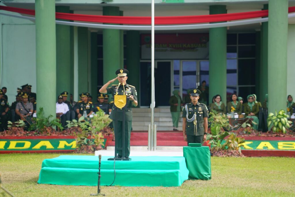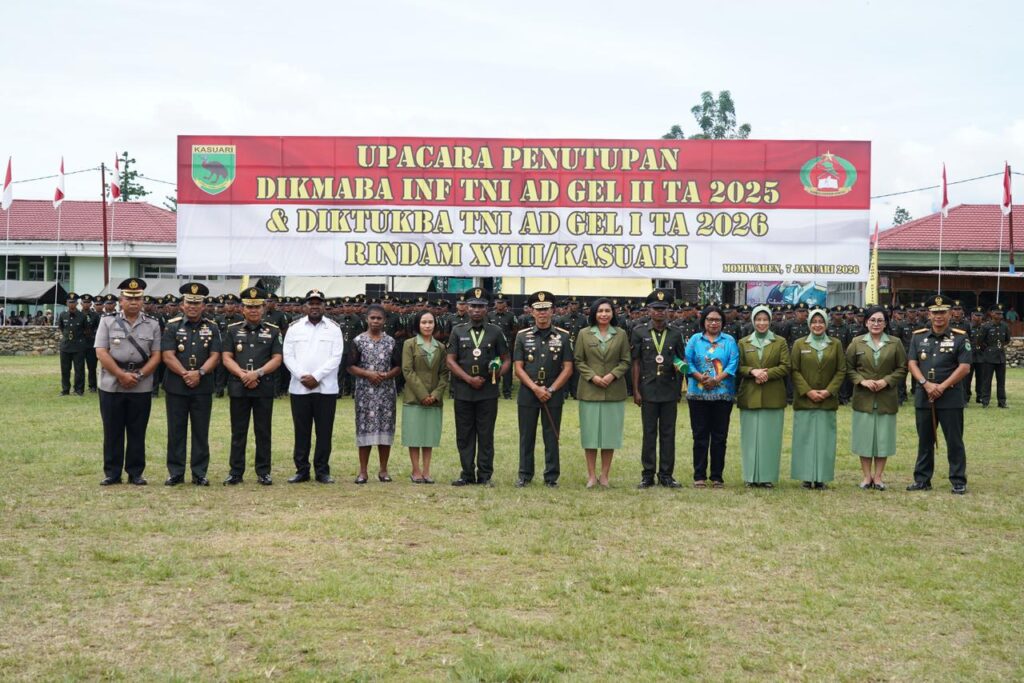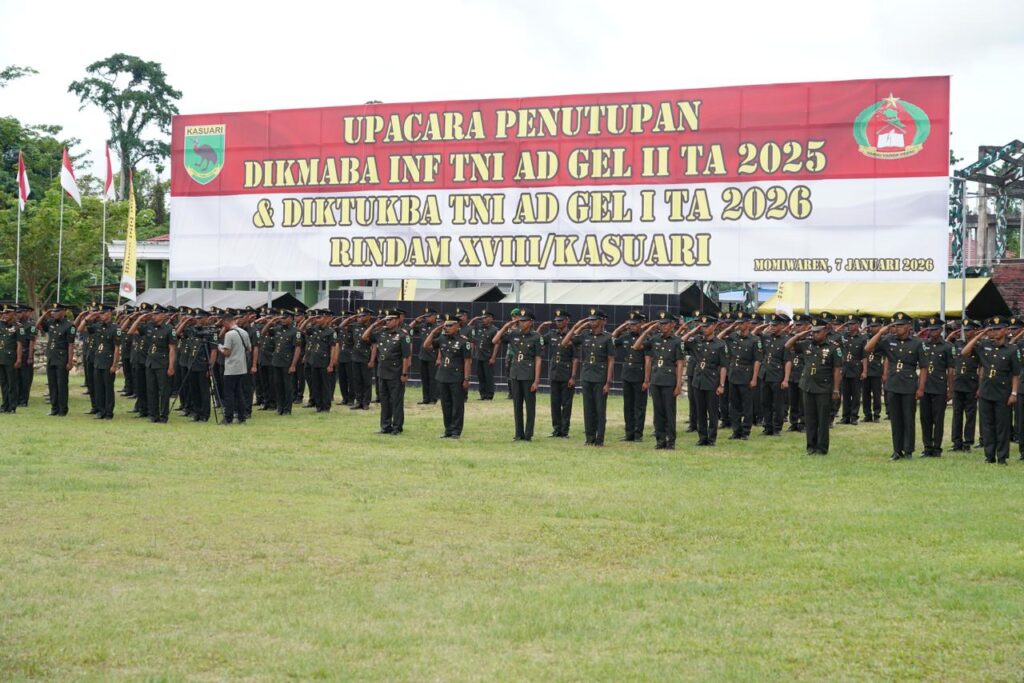 MANOKWARI SELATAN, Cakra101.com – Selamat dan sukses kepada seluruh prajurit yang dilantik. Pelantikan ini merupakan peristiwa penting dan bersejarah sebagai titik awal pengabdian kepada negara merupakan penyampaian Pangdam XVIII/Kasuari Mayjen TNI Christian Kurnianto Tehuteru saat memimpin Upacara Penutupan Pendidikan Pertama Dikmaba If TNI AD Gelombang II TA 2025, dan Pendidikan Pembentukan Diktukba TNI AD Gelombang I TA 2026, di Lapangan Upacara Mako Rindam XVIII/Kasuari, Rabu (7/1/2026).