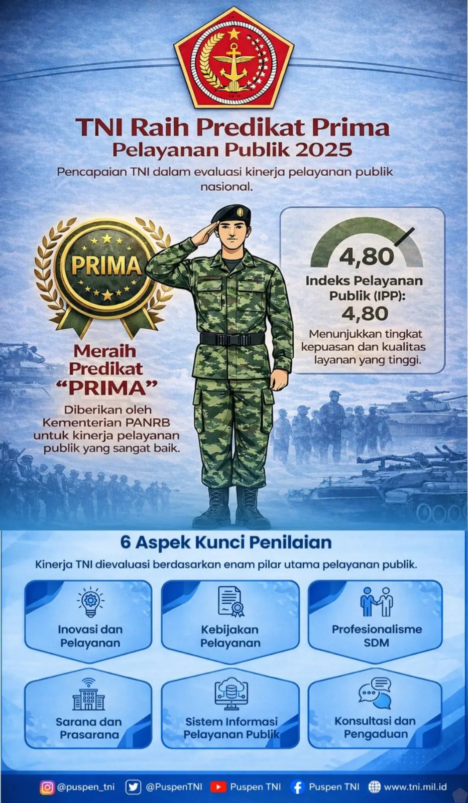 JAKARTA, Cakra101.com – Tentara Nasional Indonesia (TNI) kembali menorehkan capaian positif dengan meraih predikat A (Pelayanan Prima) pada Indeks Pelayanan Publik (IPP) TNI Tahun 2025, berdasarkan hasil pemantauan dan evaluasi Kementerian Pendayagunaan Aparatur Negara dan Reformasi Birokrasi (KemenPANRB) terhadap kinerja penyelenggaraan pelayanan publik di kementerian/lembaga dan Pemerintah Daerah.