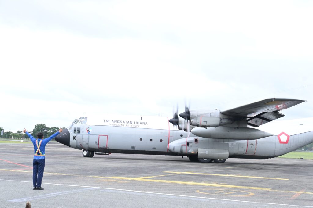 Bantuan kemanusiaan yang sebelumnya telah terkumpul di Posko Terpadu Lanud Sjamsudin Noor disalurkan menggunakan pesawat angkut C-130 Hercules dengan nomor registrasi A-1328. Pesawat tersebut diberangkatkan dari Lanud Sjamsudin Noor menuju Lanud Halim Perdanakusuma.