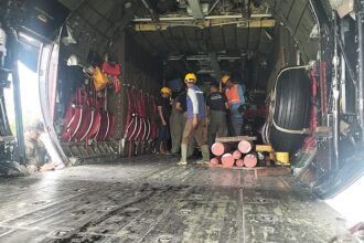 Sejumlah petugas bahu-membahu mengangkat serta menata tiang-tiang listrik ke dalam badan pesawat, memastikan keselamatan selama penerbangan. Pemanfaatan pesawat TNI AU menjadi solusi yang efektif untuk mempercepat distribusi logistik ke wilayah yang memiliki keterbatasan akses jalur darat.