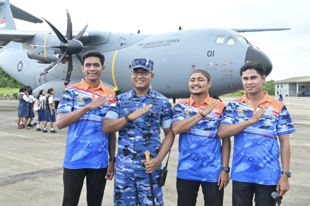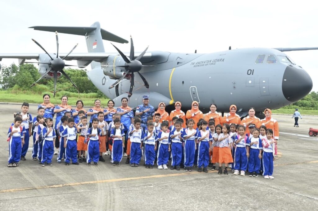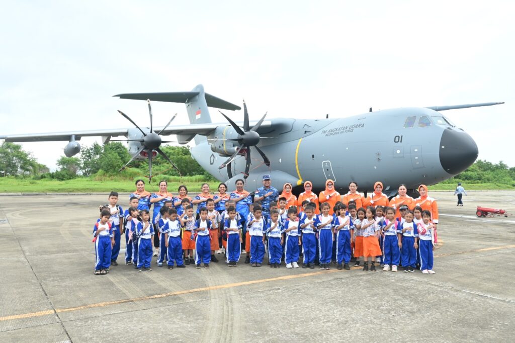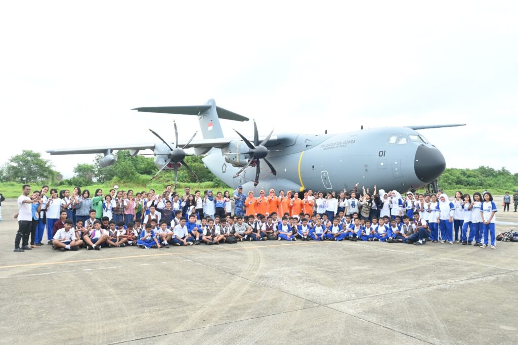 Suasana ceria tampak saat para siswa diajak mengenal pesawat berukuran besar tersebut dari jarak dekat. Mereka juga dikenalkan pada bagian-bagian pesawat serta fungsi Airbus A400M yang digunakan untuk mendukung berbagai tugas TNI AU.