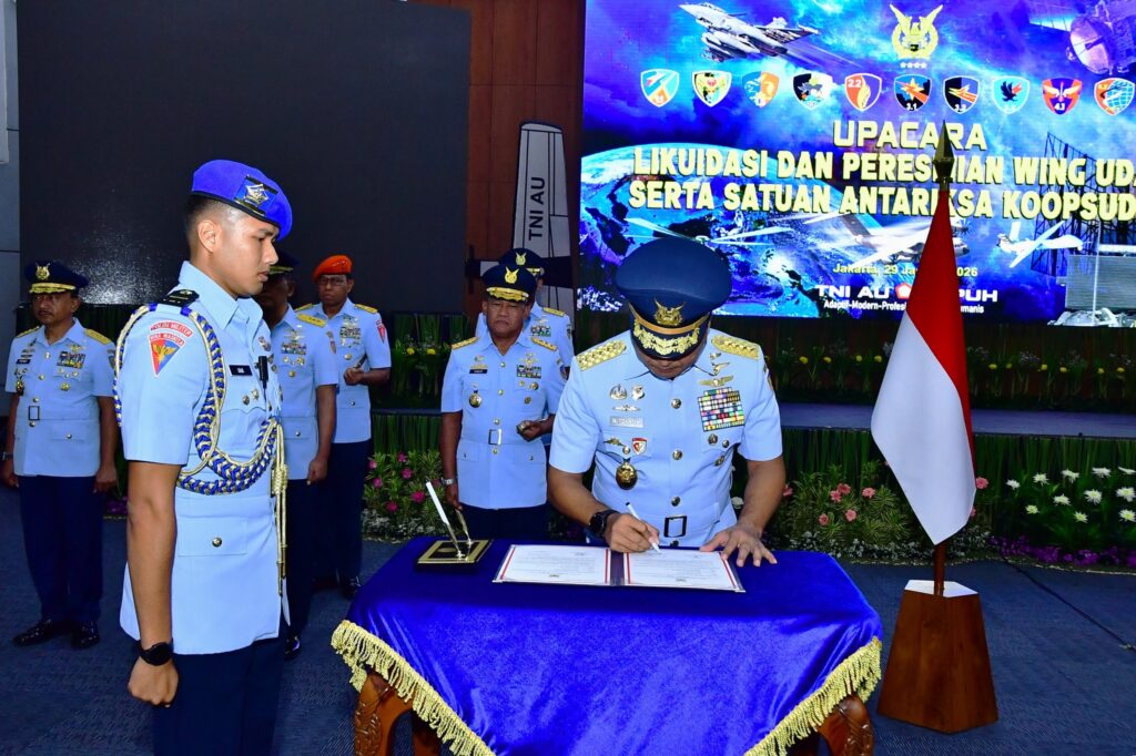 JAKARTA, Cakra101.com – Kepala Staf Angkatan Udara (KASAU) Marsekal TNI M. Tonny Harjono, S.E., M.M., memimpin upacara Likuidasi dan Peresmian Wing Udara serta Satuan Antariksa Koops Udara Nasional (Koopsudnas) di GSG Suharnoko Harbani, Mabesau, Cilangkap, Jakarta Timur, Kamis (29/1/2026).