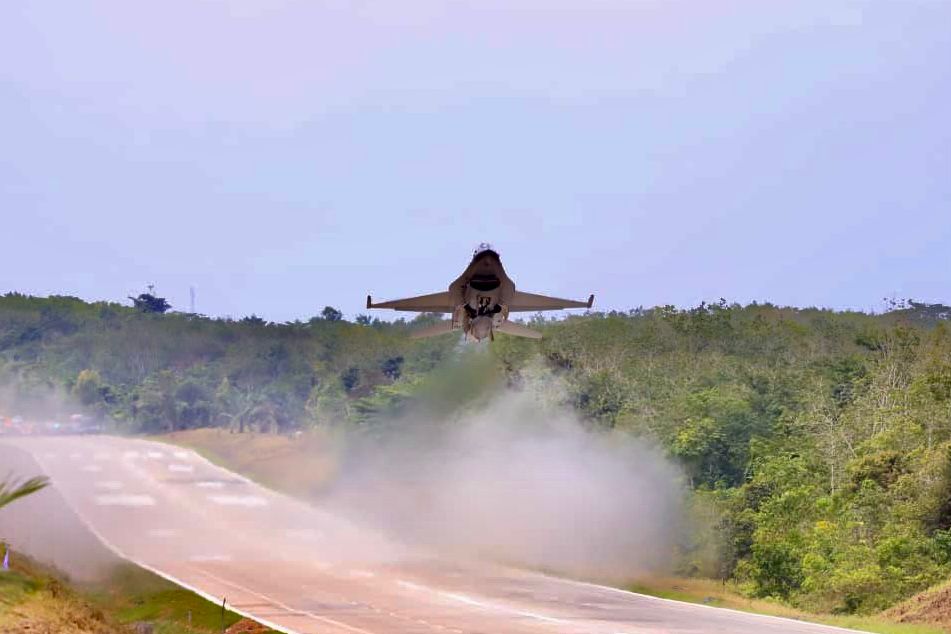 LAMPUNG, Cakra101.com – Pesawat tempur TNI Angkatan Udara, EMB-314 Super Tucano dan F-16 Fighting Falcon, berhasil melaksanakan uji coba pendaratan dan lepas landas di ruas Jalan Tol Terpeka Simpang Pematang, Lampung.