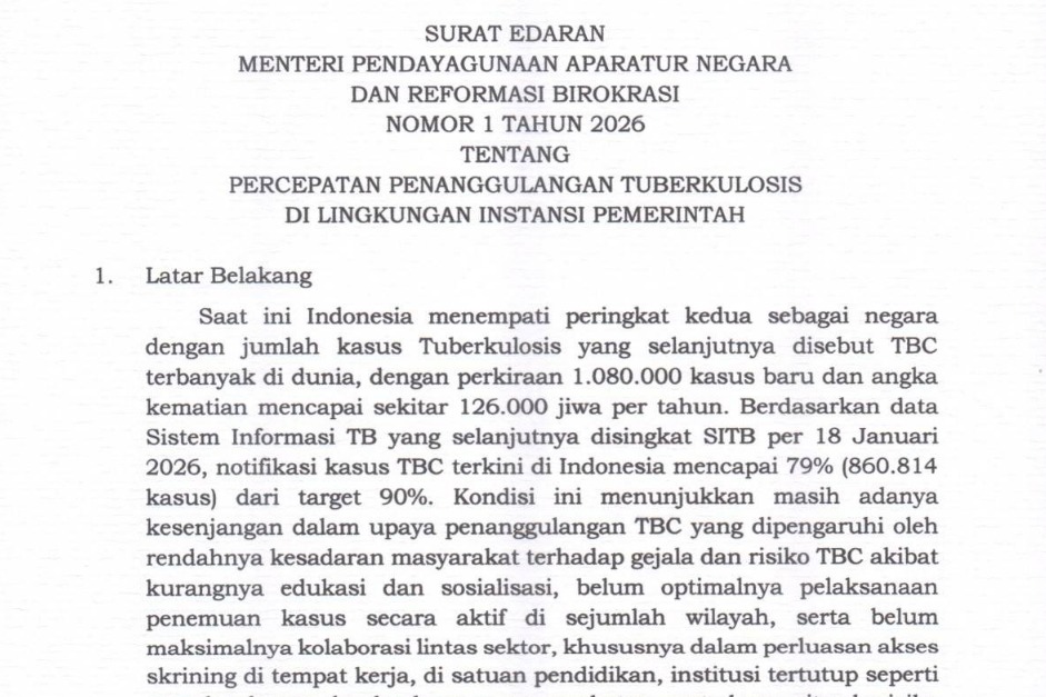 JAKARTA, Cakra101.com – Percepatan penanggulangan tuberkulosis (TBC) menjadi salah satu program prioritas pemerintah di bidang kesehatan, dengan target menurunkan kasus TBC hingga 50 persen dalam lima tahun. Sebagai bagian dari implementasi program tersebut, Menteri Pendayagunaan Aparatur Negara dan Reformasi Birokrasi (PANRB) Rini Widyantini menerbitkan Surat Edaran (SE) Nomor 1 Tahun 2026 tentang Percepatan Penanggulangan Tuberkulosis di Lingkungan Instansi Pemerintah.