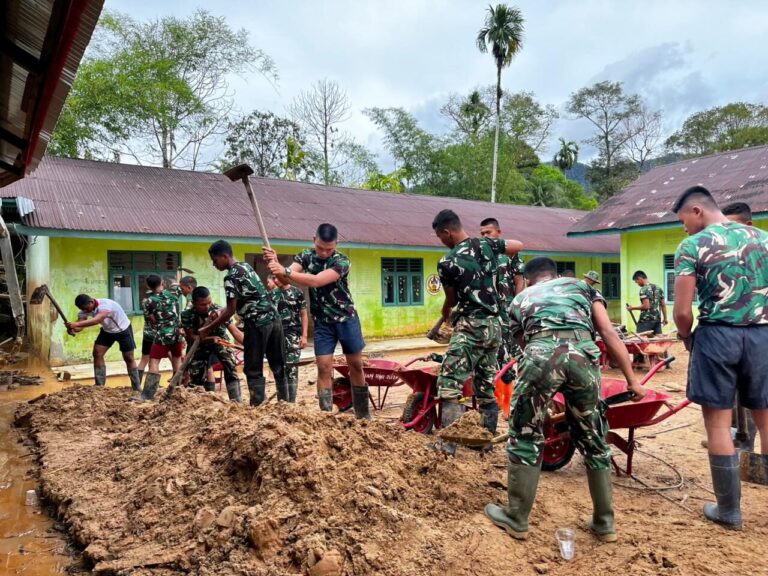 Dengan menggunakan peralatan manual seperti angkong, sekop, dan cangkul, personel Satgas secara bertahap mengangkat lumpur dan membersihkan sisa material banjir hingga seluruh area terdampak dapat kembali difungsikan untuk mendukung kegiatan belajar mengajar.