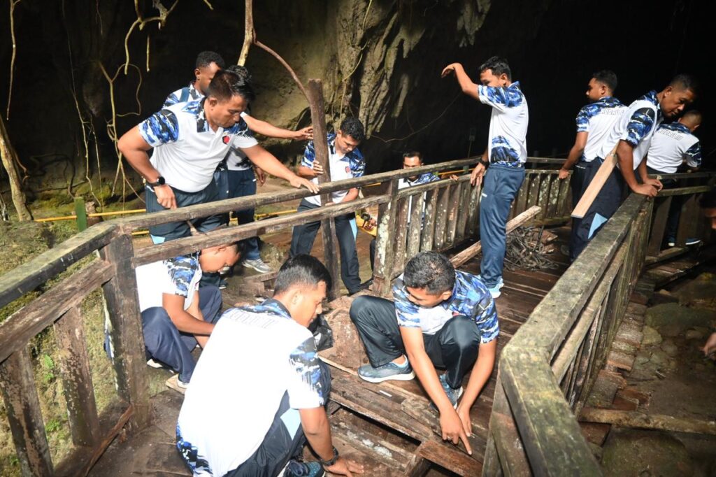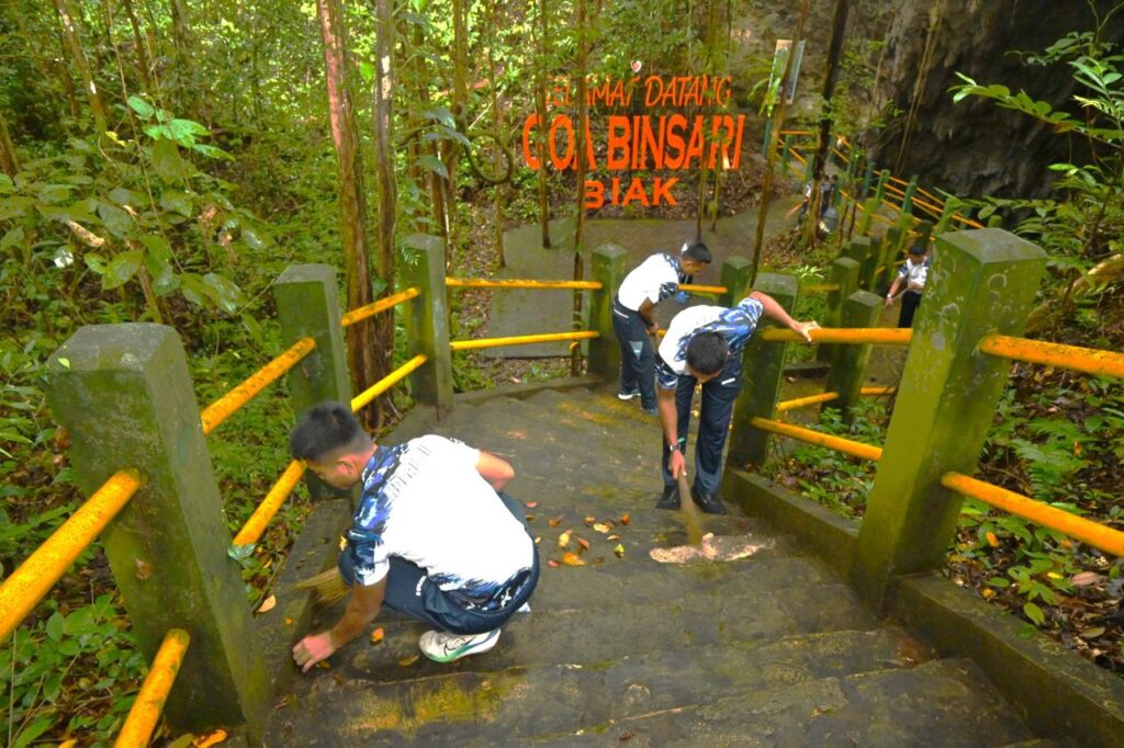Dalam pelaksanaannya, kegiatan difokuskan pada pembersihan area depan Goa Binsari serta pembenahan tangga di bagian dalam goa yang menjadi salah satu lokasi bersejarah di wilayah tersebut.