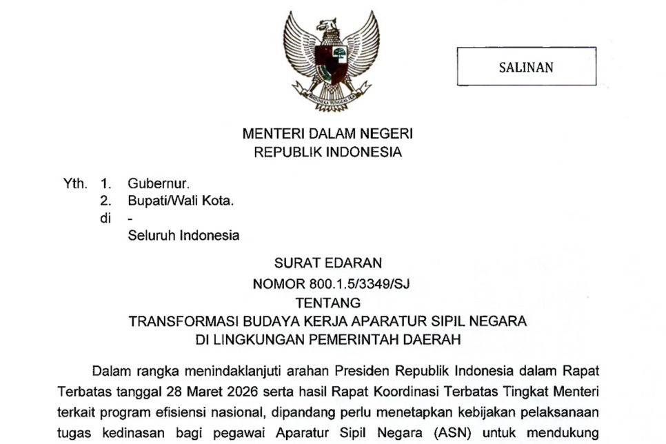 JAKARTA, Cakra101.com — Pemerintah melalui Kementerian Dalam Negeri Republik Indonesia menetapkan kebijakan transformasi budaya kerja Aparatur Sipil Negara (ASN) di lingkungan pemerintah daerah (pemda) guna mendorong pola kerja yang lebih efisien, produktif, dan berbasis digital.