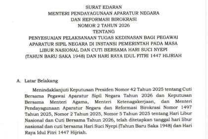 JAKARTA, Cakra101.com – Pemerintah melalui Menteri Pendayagunaan Aparatur Negara dan Reformasi Birokrasi (PANRB) menerbitkan Surat Edaran Nomor 2 Tahun 2026 tentang Penyesuaian Pelaksanaan Tugas...