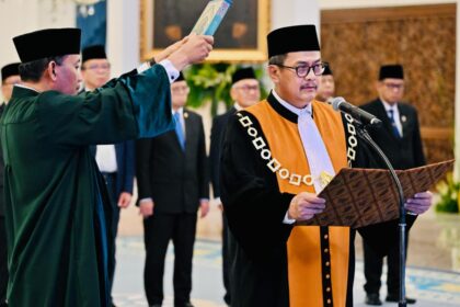 JAKARTA, Cakra101.com – Presiden Prabowo Subianto menyaksikan pengucapan sumpah Dwiarso Budi Santiarto sebagai Wakil Ketua Mahkamah Agung (MA) Bidang Non Yudisial di Istana Negara, Jakarta, Seni...